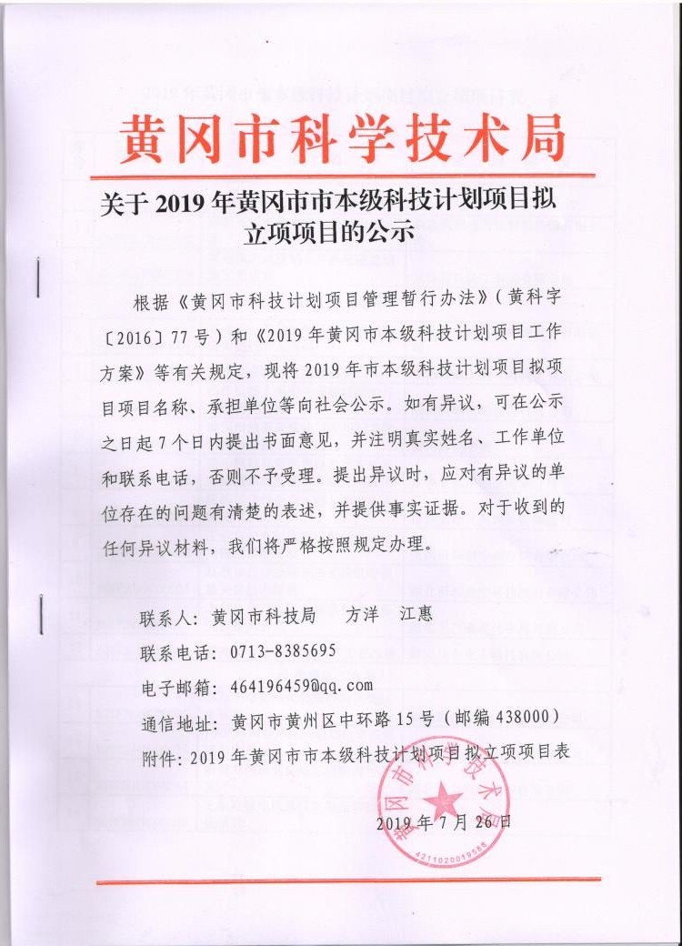 2019年黃岡市市本級科技計劃項目擬立項項目表