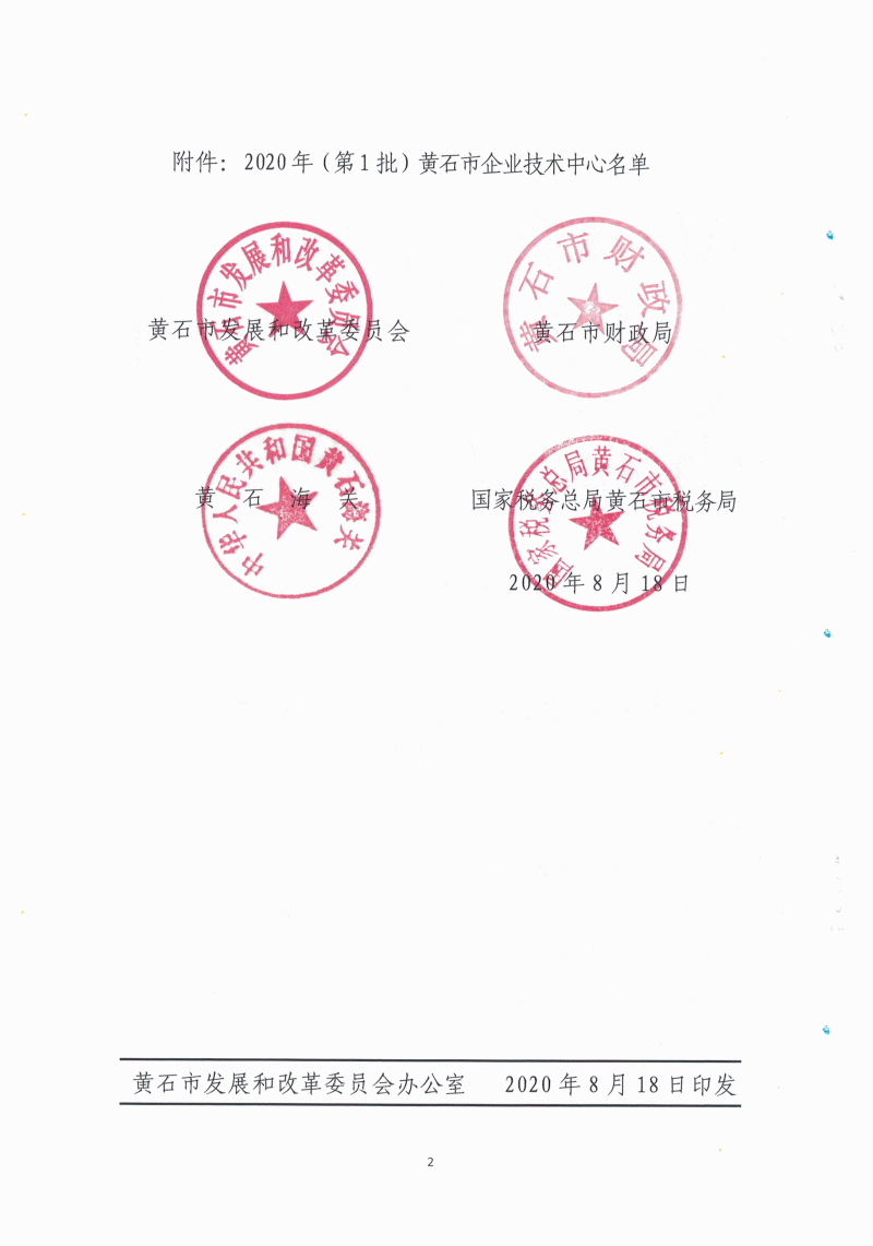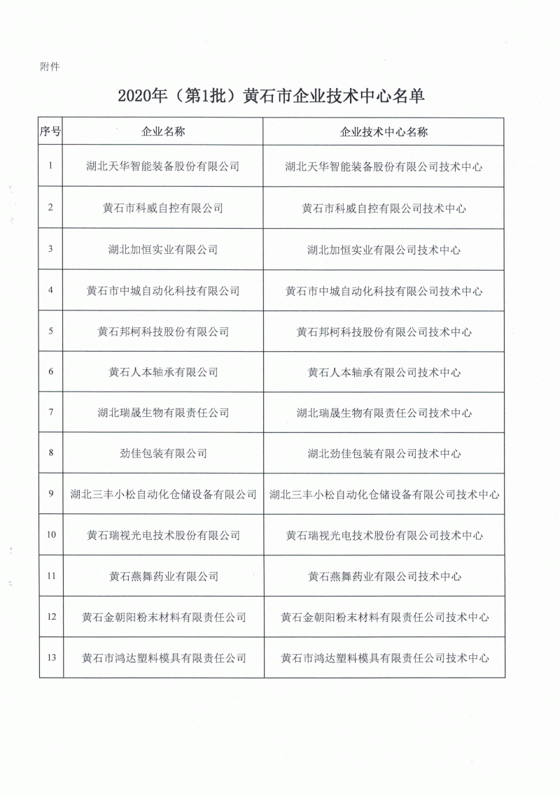 2020年(第1批)黃石市企業(yè)技術(shù)中心名單公布